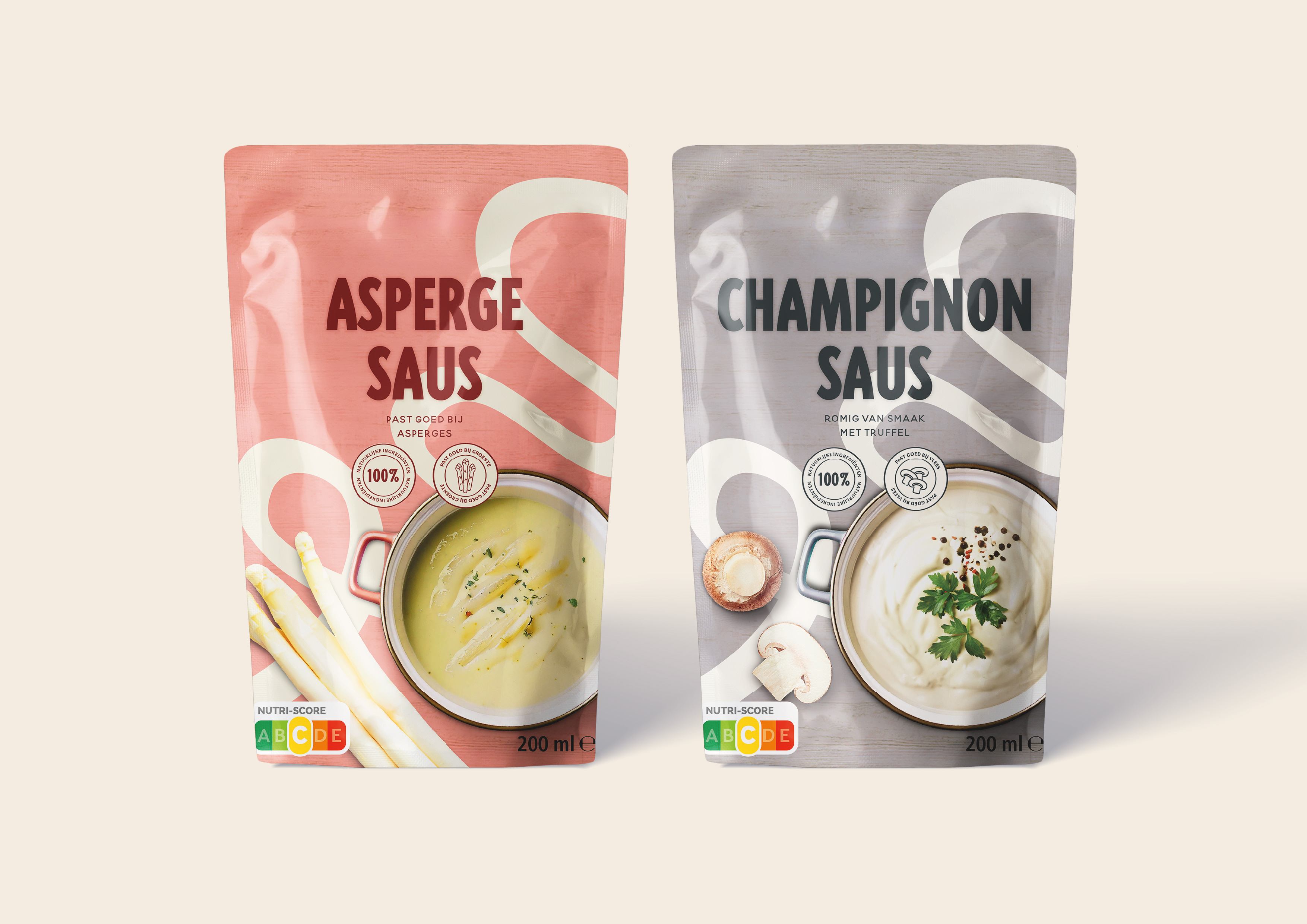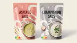 Het swirl-element verwijst naar het schenken en combineren van de saus over verschillende gerechten. De kleuren zijn afgestemd op de ingrediƫnten en zorgen samen voor een frisse, hippe uitstraling.
